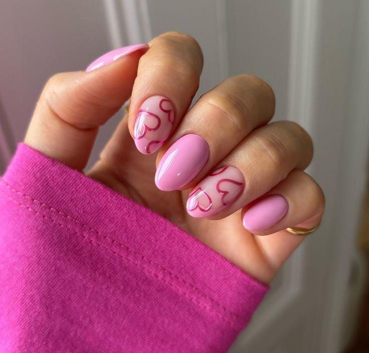 Soft pink nails mix glossy solids with playful heart line art for a cute, flirty look. The design feels light, youthful, and perfect for a casual fun Valentine vibe.