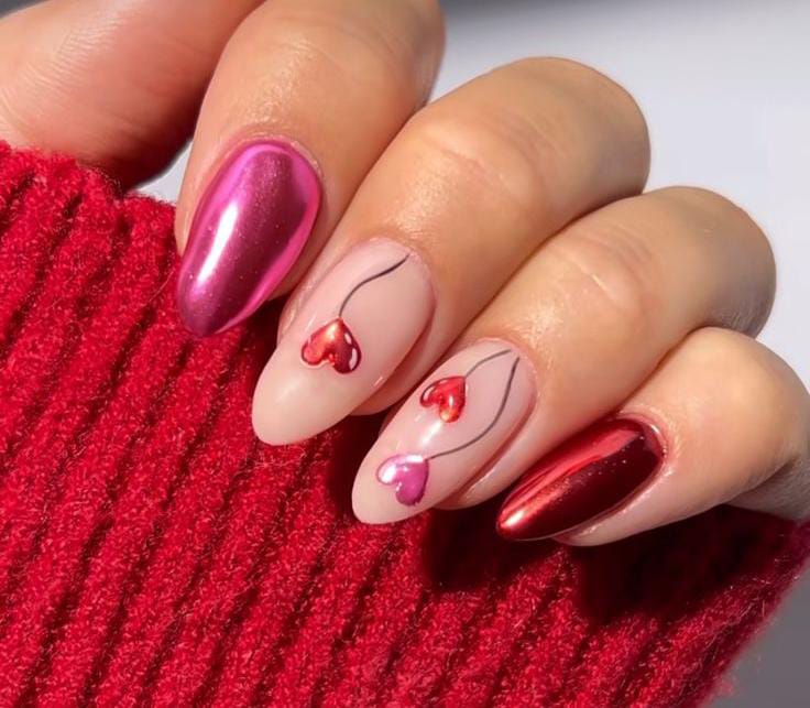 Classic red and nude nails are mixed with asymmetrical heart details for a modern Valentine look. It feels bold, trendy, and perfect for someone who likes fun but polished designs.
