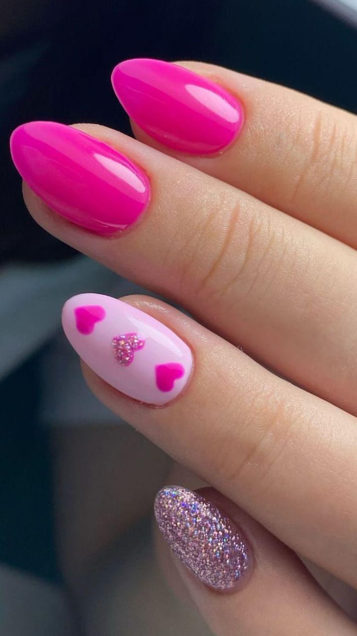Bright pink shades pair with mini heart accents and a touch of glitter for a cheerful, candy-inspired style. The overall vibe is fun, sweet, and eye-catching Valentines.
