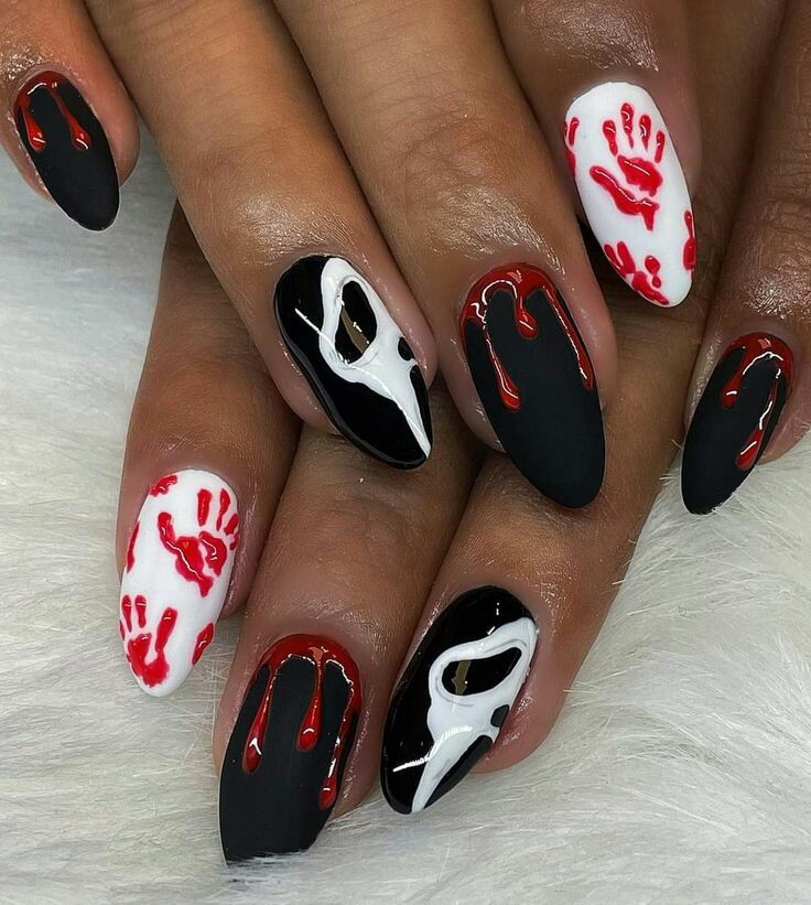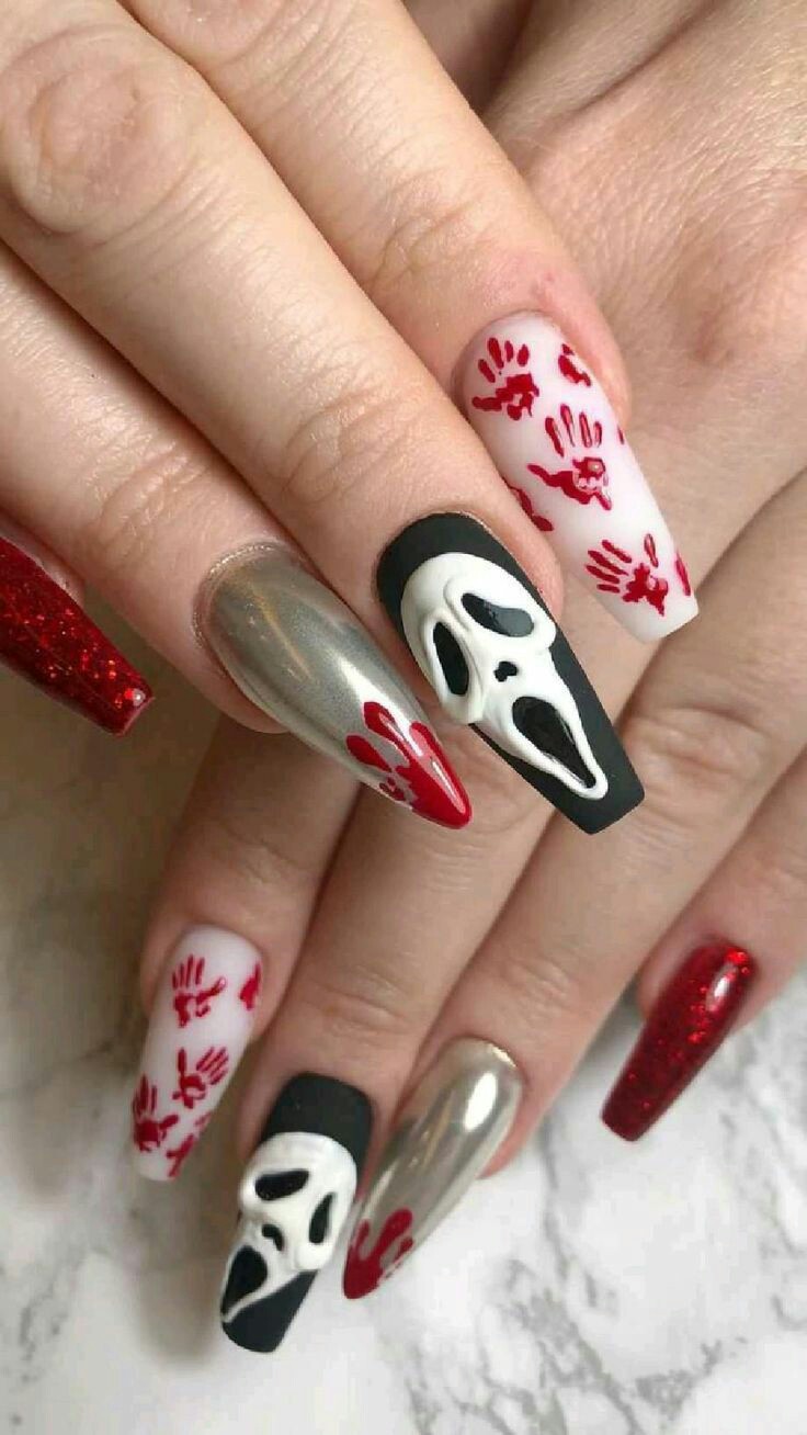 A mix of matte black, metallic silver, and white nails with bloody handprints and 3D Ghostface masks for a chilling horror look.
