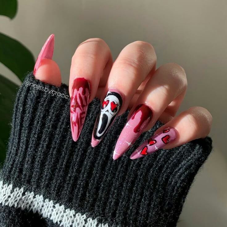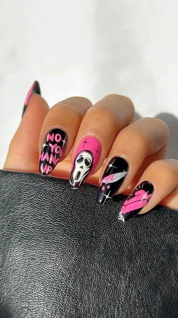Bright pink and black nails with Ghostface, broken hearts, and playful text, creating a fun, edgy take on scary-chic nails.