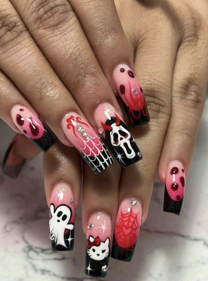 A playful blend of pink, red, and black with ghostface, webs, dripping designs, and even a cute cat accent for a spooky-but-sweet vibe.