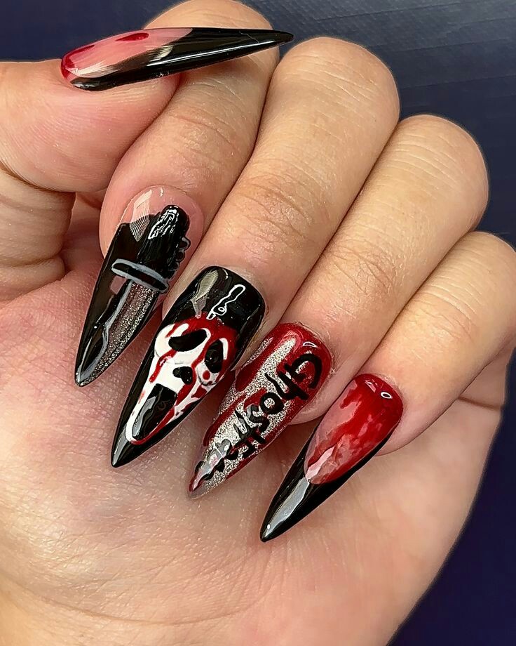 Sharp stiletto nails in black and red with ghostface, dripping blood, and bold horror accents for a dramatic, edgy look.