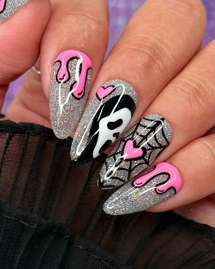 Silver glitter base with pink drips, spider webs, and ghostface for a sparkly yet eerie Halloween feel.