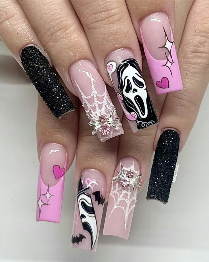 Square nails with pink and black tones, ghostface art, webs, bats, and 3D rhinestone spiders for a glam-meets-scary effect.