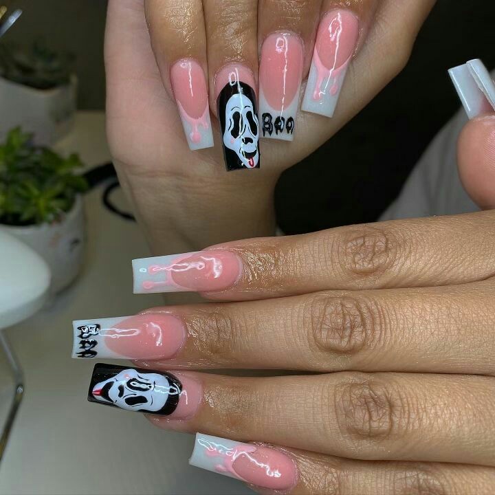 Pink and black nails with ghostface, bats, dripping effects, and cute “Boo!” text for a fun, girly twist.