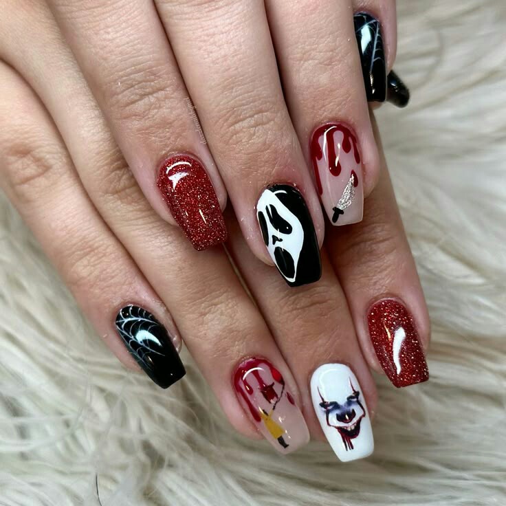 This set mixes bold red glitter, spooky ghostface art, dripping blood, and even a creepy clown for a full-on horror vibe.