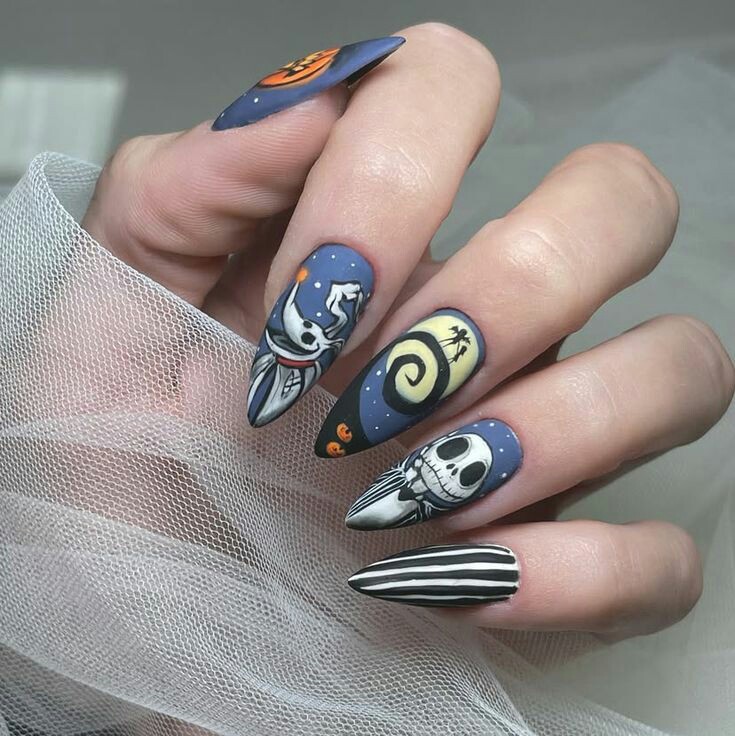 Inspired by The Nightmare Before Christmas, these nails show eerie skies, pumpkins, and iconic characters for a playful yet spooky look.
