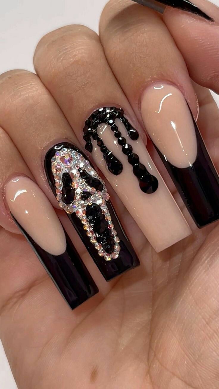This design uses nude and black polish with rhinestone ghostface art and glossy drip accents for a spooky but glamorous effect.