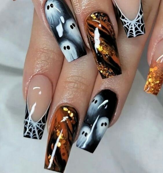 Long coffin nails with glowing orange glitter, ghost silhouettes, and cobweb details for a spooky Halloween feel.