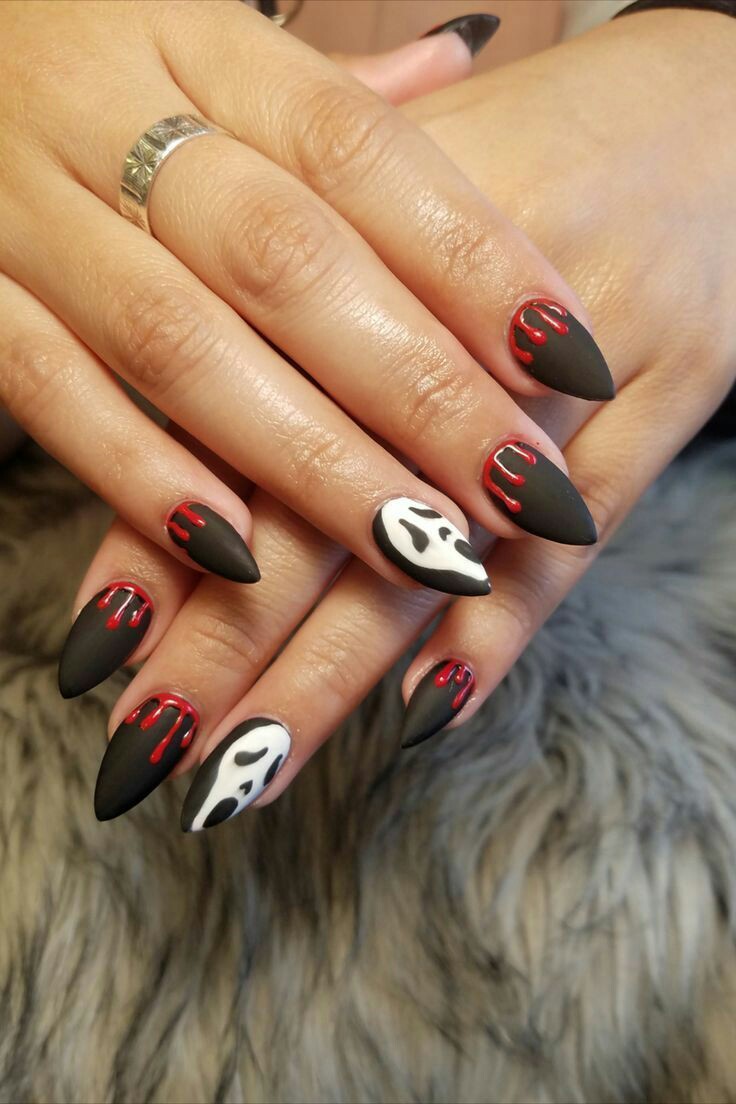 Matte black nails with red blood-drip details and ghostface accents create a dark, chilling Halloween style.