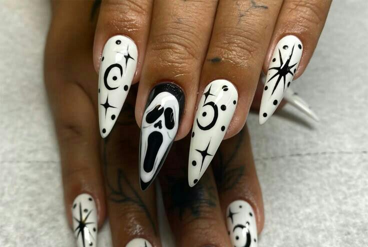 A black-and-white design with sharp stiletto tips, featuring ghostface alongside starry swirls and celestial accents.