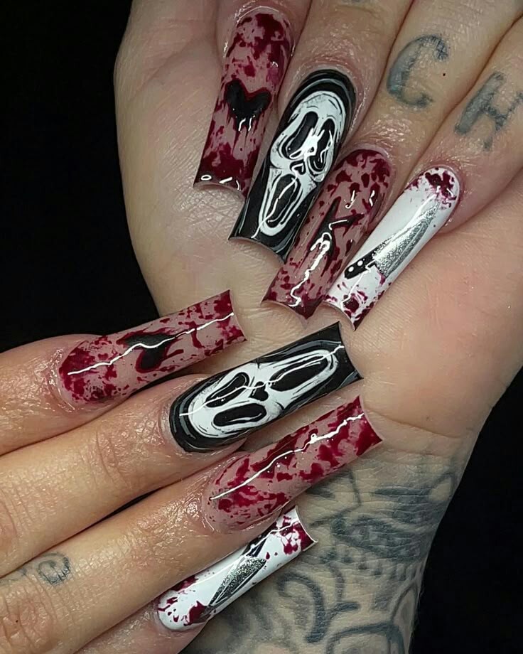 Long coffin nails with blood splatters, knife, ghostface portraits, and “Scream” text for a full-on horror theme.