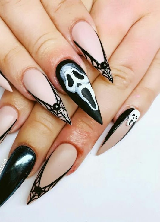 Nude and black stiletto nails with 3D web patterns, metallic accents, and ghostface for a chic but spooky look.