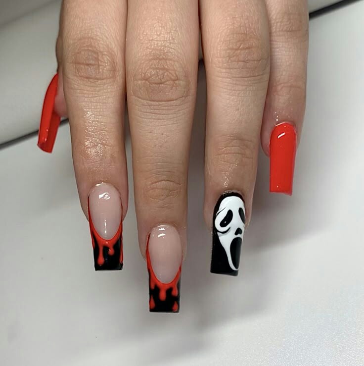 Bold red and black square tips with dripping flame-like designs and a ghostface centerpiece.