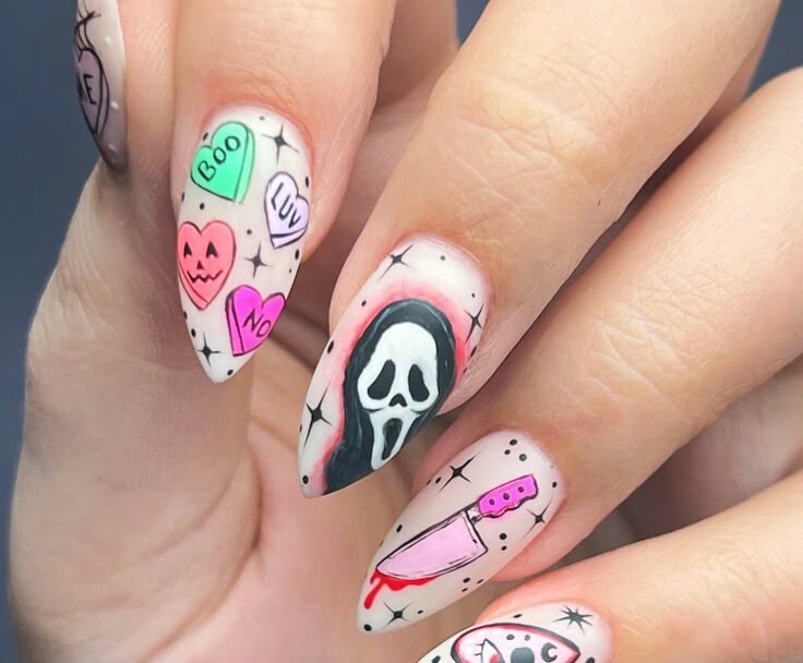 Playful pastel-inspired ghostface nails decorated with candy hearts, stars, and a bloody knife for a cute yet creepy twist.
