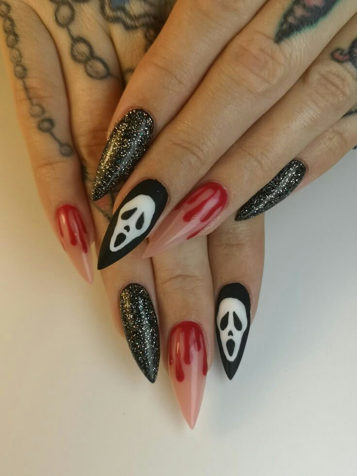 Sharp stiletto nails mixing black glitter, red drips, and the iconic ghostface for bold horror vibes.
