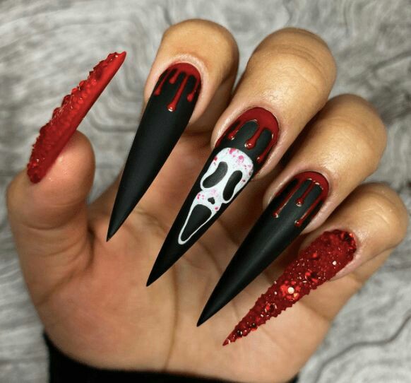 Matte black and deep glittery red nails with blood drips and ghostface art, giving a dramatic, sinister edge.