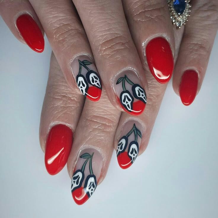 Bright red nails mixed with playful ghostface-cherry designs for a quirky, fun twist on horror chic.