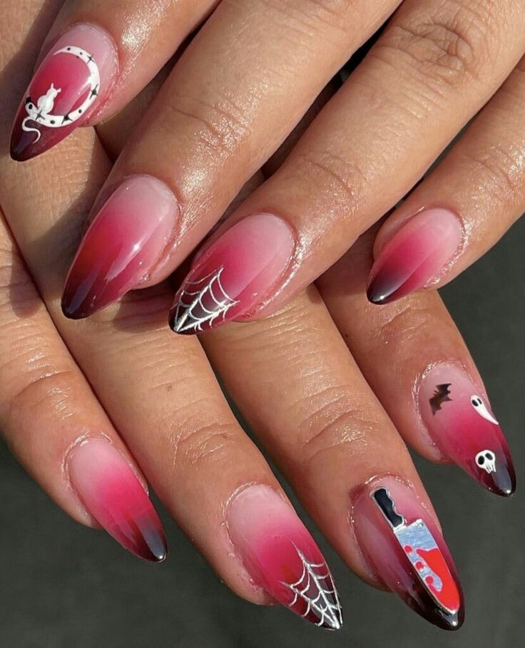 A sharp stiletto set with red-to-black ombré and spooky details like spiderwebs, skulls, and dripping blood for a chilling horror vibe.