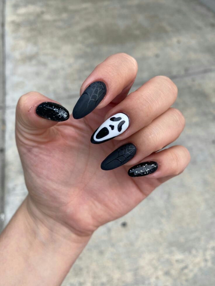 Matte black nails accented with subtle spiderwebs and a bold Ghostface mask, giving a dark, eerie edge.