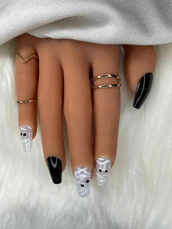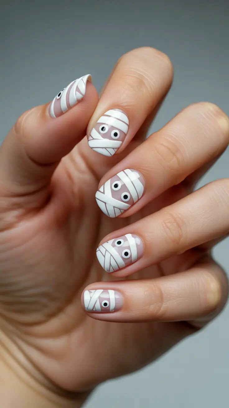 Classic black and white nails featuring mummy wrap patterns with cute ghostly eyes, simple yet eerie.