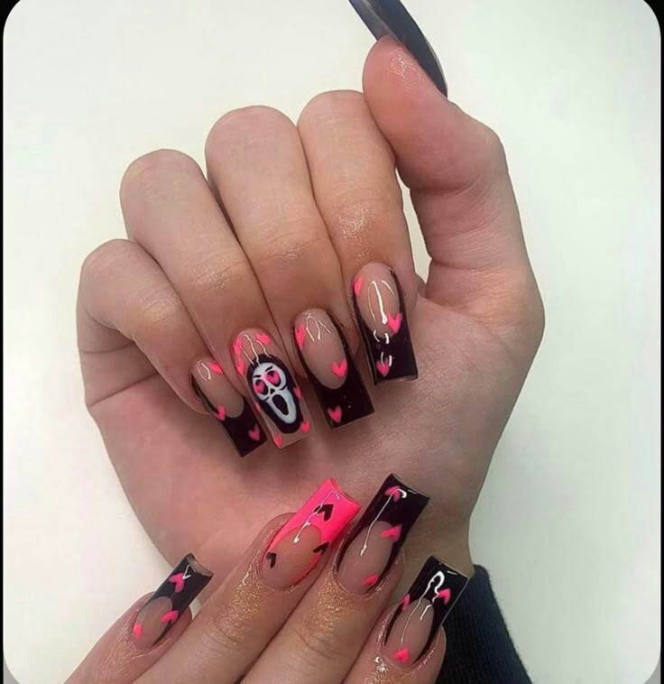 Square black-and-nude nails decorated with hot pink hearts and a glowing Ghostface mask, blending scary with flirty.