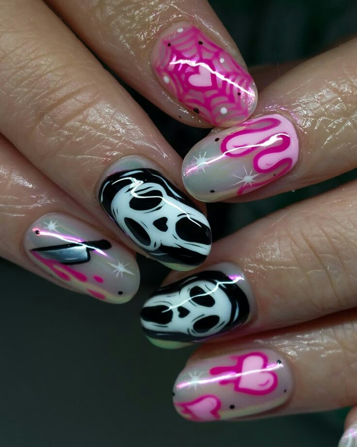 Glossy nails featuring Ghostface, neon pink drips, spiderwebs, and hearts, creating a fun mix of creepy and colorful.