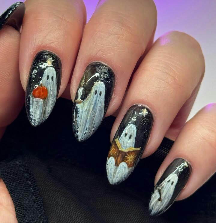 Black nails with hand-painted white ghosts holding pumpkins, candles, and spell books, giving off a spooky yet playful Halloween vibe.