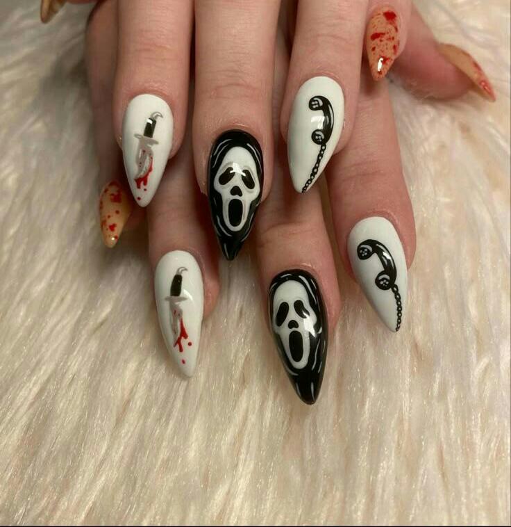 Sharp black-and-white nails featuring the iconic Ghostface mask, bloody knives, and vintage phones for a true slasher-movie look.