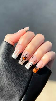 Soft nude and white nails decorated with tiny ghosts, spider webs, stars, and pumpkins — a fun and lighthearted Halloween twist.