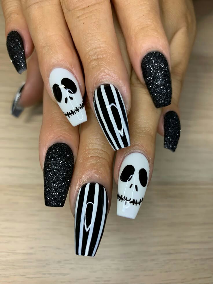 Black glitter and striped nails paired with bold skull faces, inspired by a gothic, Tim Burton–style Halloween aesthetic.