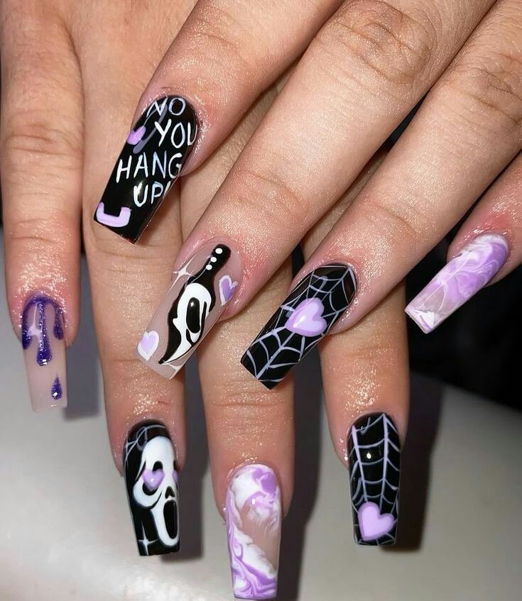 A playful take with purple hearts, spiderwebs, ghostface art, and marbled designs, blending creepy with cute.