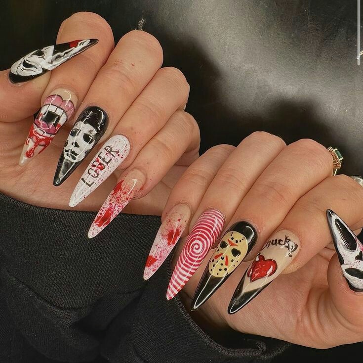 Long stiletto nails featuring detailed horror icons, blood splatters, and eerie phrases, giving off a full-on scary movie vibe.