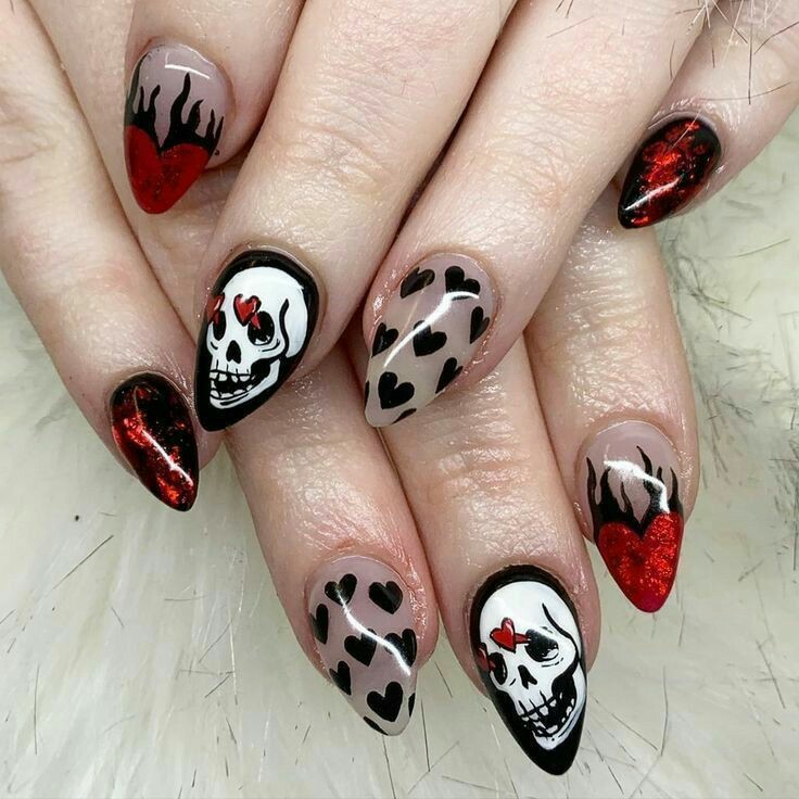 Bold skull designs mixed with black hearts, red flames, and glittery accents, blending creepy and romantic vibes.