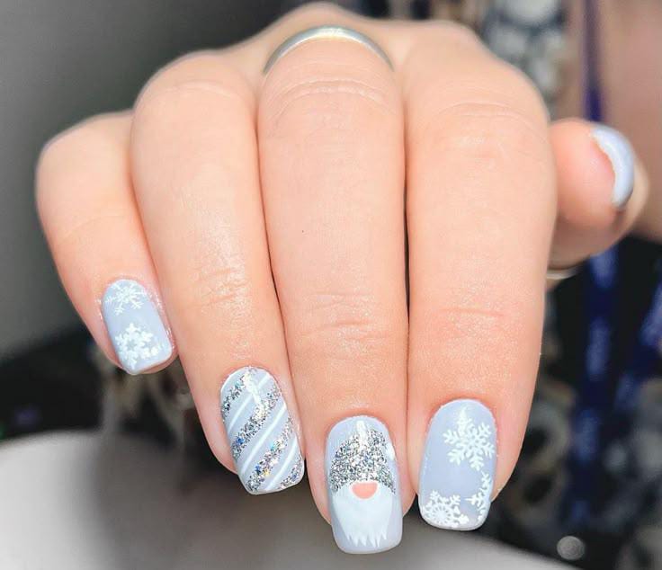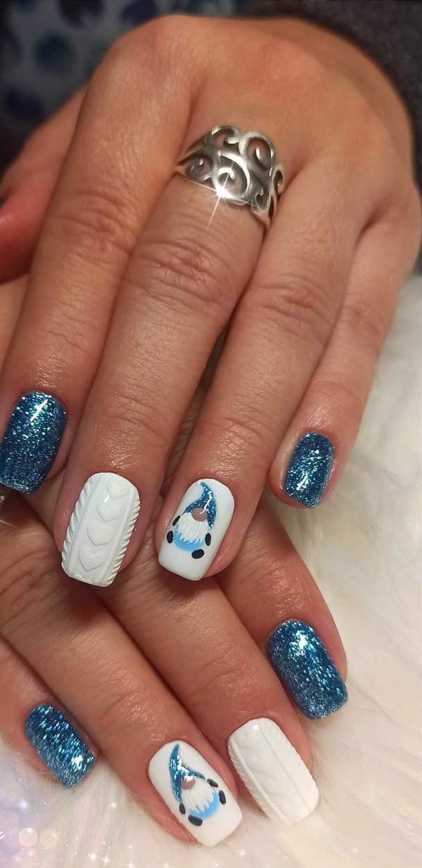 This design mixes icy blue glitter nails with cozy white sweater textures and a cute gnome accent, giving a crisp and Christmas festive winter vibe.