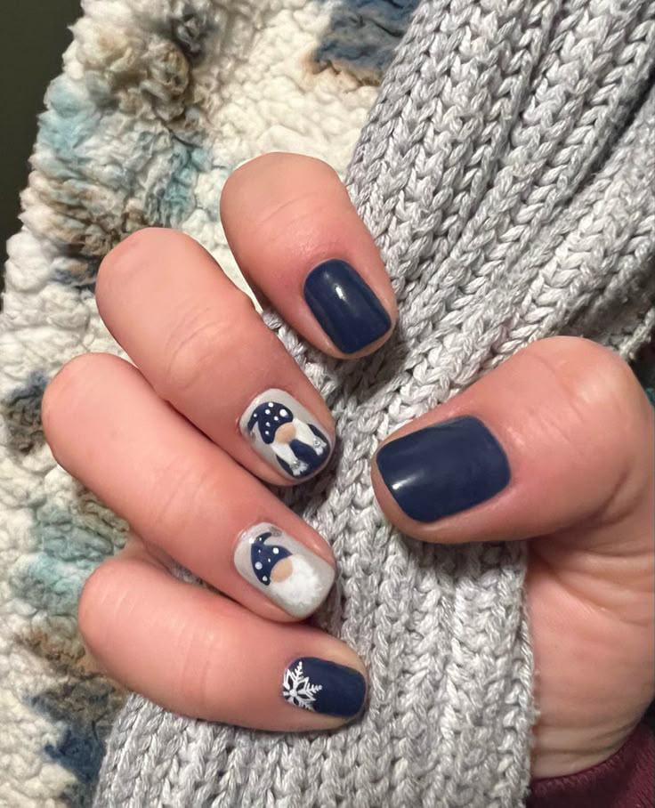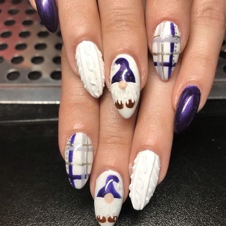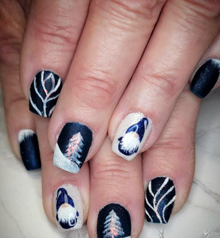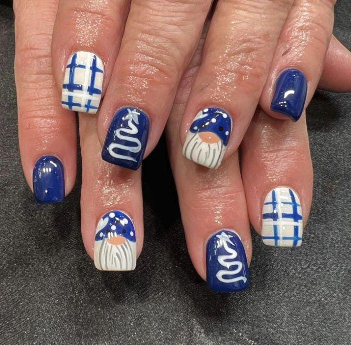 A bold mix of navy blue and white gives this manicure a cool winter vibe, with plaid patterns, gnome faces, and swirly white accents that feel both fun and frosty.