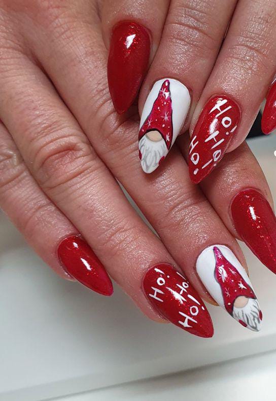 Featuring a cheerful “Ho Ho Ho” and adorable Santa gnome art, this glossy red and white manicure captures the joyful spirit of the Christmas holiday season in a fun, whimsical way.