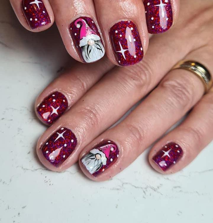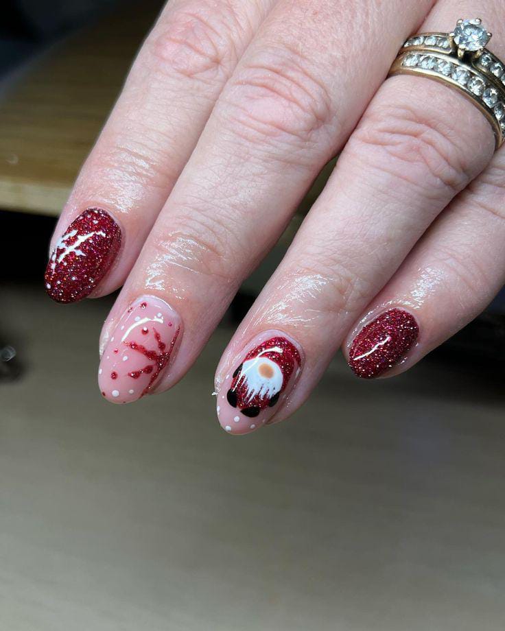 A mix of glittery red polish and soft nude tones with tiny white dots, this design highlights a sweet gnome detail that adds just the right touch of christmas festive sparkle.