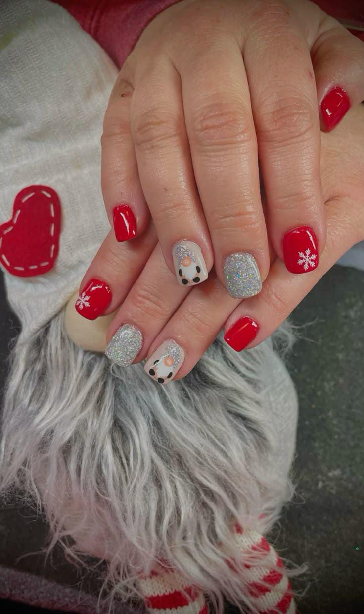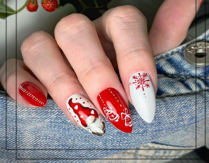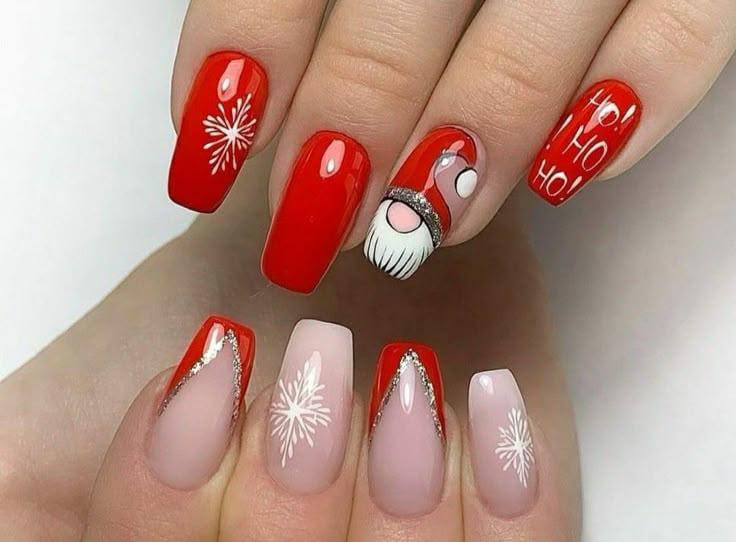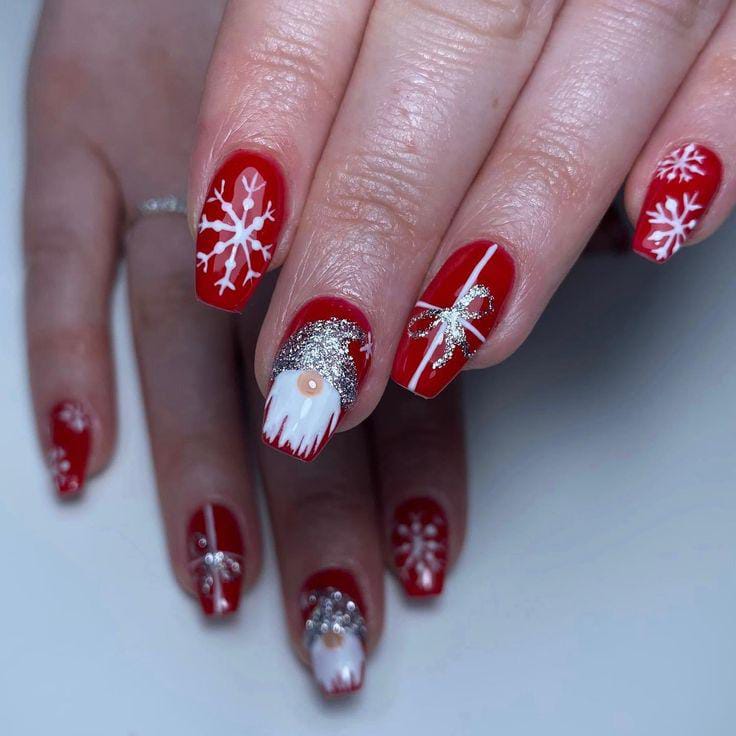 This festive red and nude manicure mixes cheerful gnome art, snowflakes, and silver accents, creating a lively holiday look that’s both fun and classic Christmas.