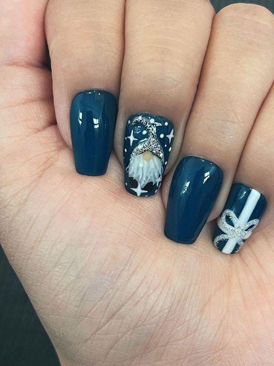A deep navy-blue base with shimmering silver and white details gives off cozy winter-night vibes, complete with a gnome accent and a sparkling Christmas gift bow.