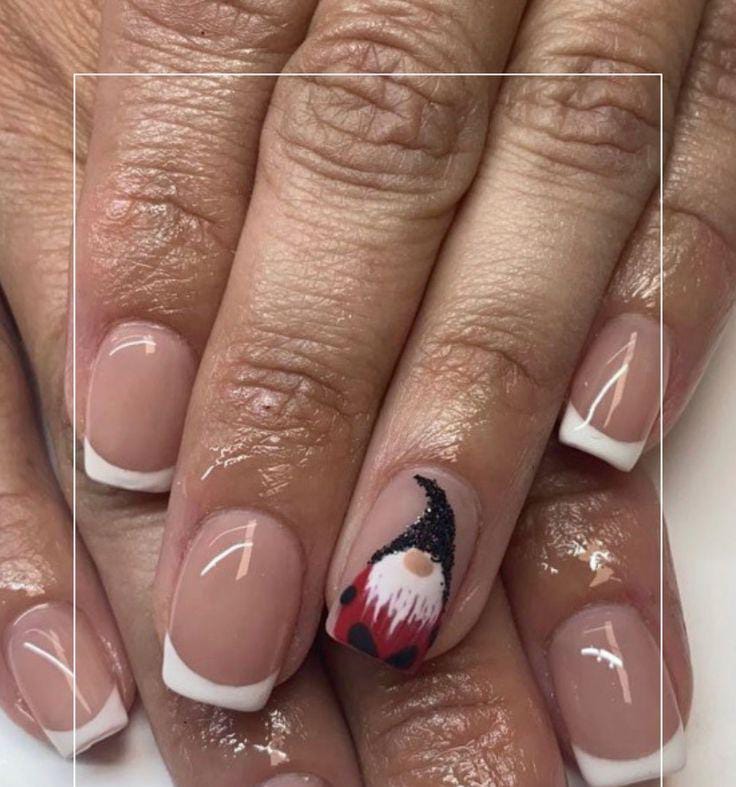 A timeless nude French manicure with a playful twist, featuring a cute gnome on one nail that adds just the right touch of Christmas charm.