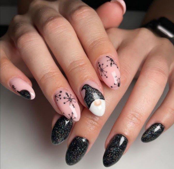Soft pink and glittery black nails blend elegance with whimsy, showcasing delicate starburst designs and a charming gnome for a stylish winter Christmas night look.