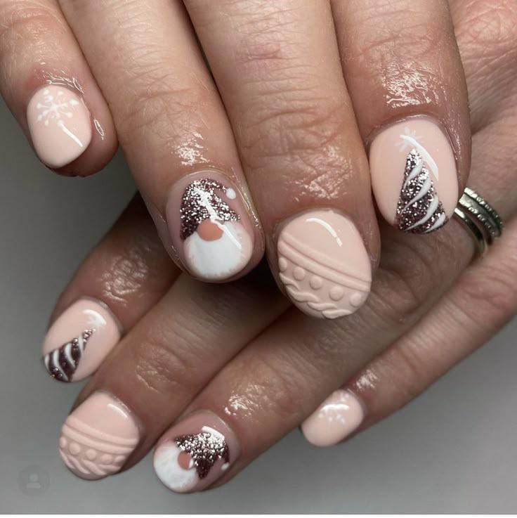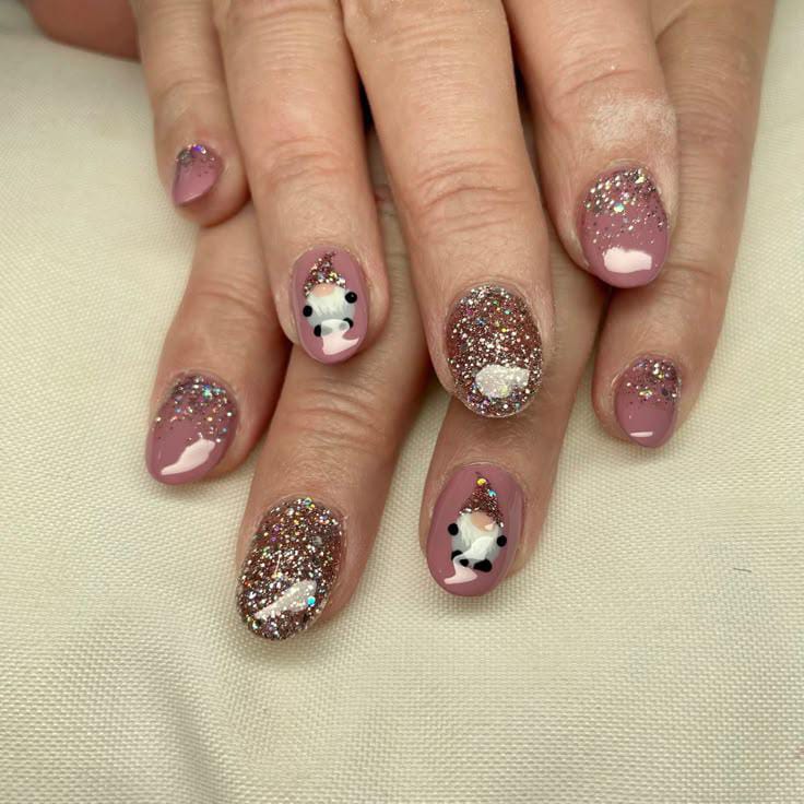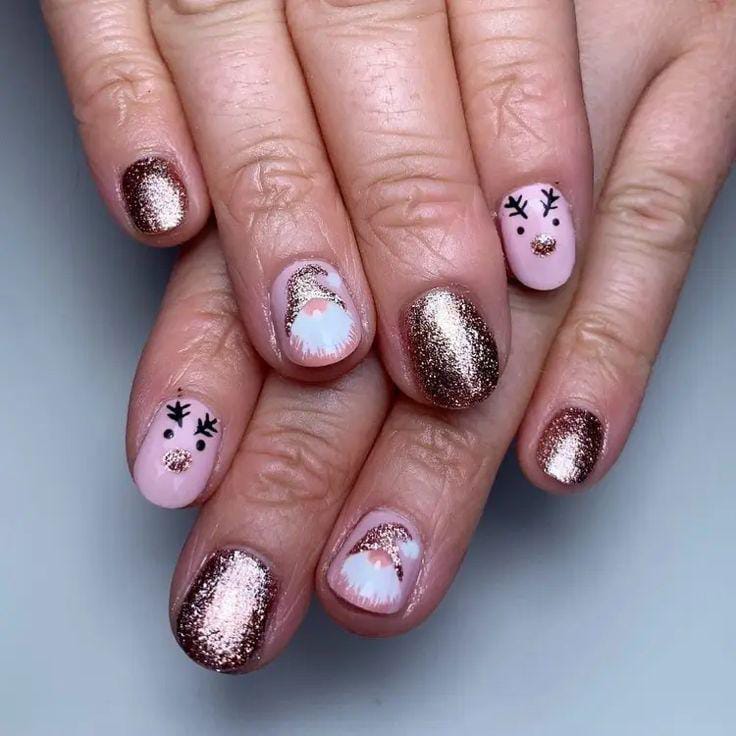 A mix of rose gold glitter and pale pink polish with cute reindeer and gnome motifs gives these nails a warm, festive glow full of Christmas spirit.