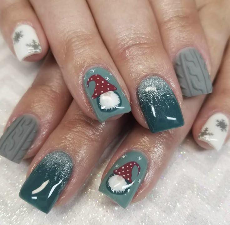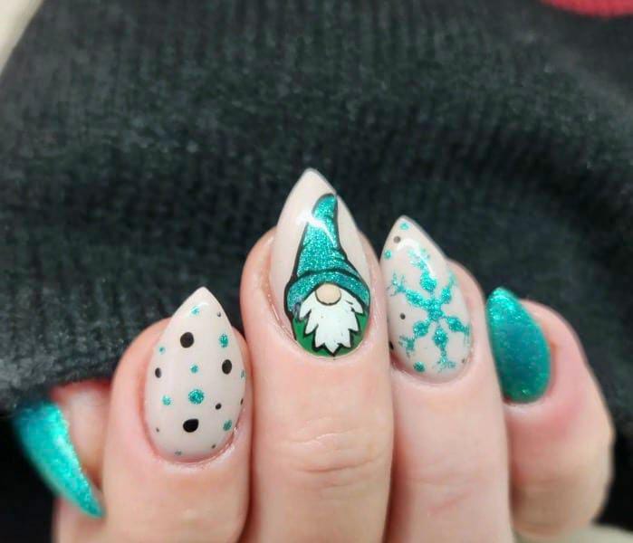 This design pairs shimmering teal tones with soft nude bases, dotted details, and a glittery gnome centerpiece that brings a fresh, modern twist to Christmas style.