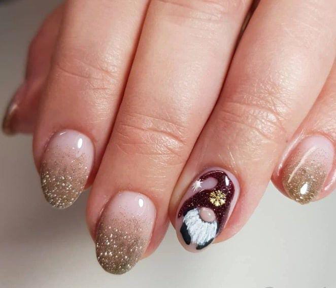 Soft nude tones blend with shimmering gold glitter and adorable gnome accents, creating a sweet, wintry look that feels both playful and elegant Christmas.
