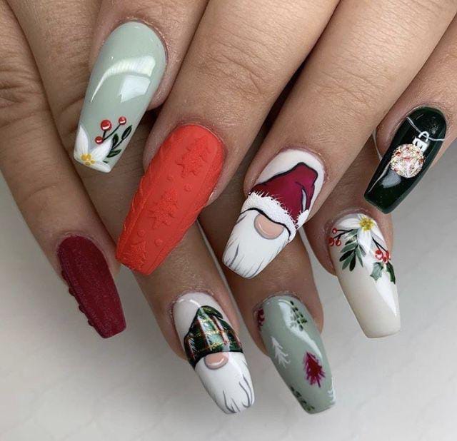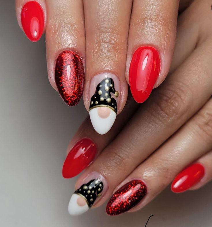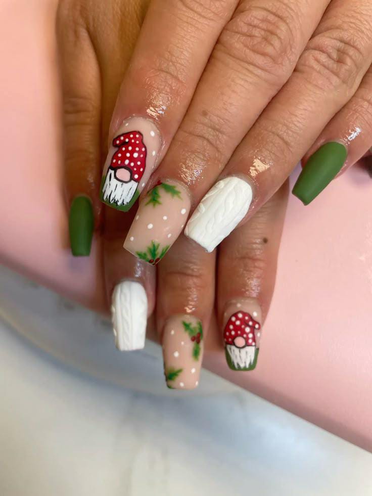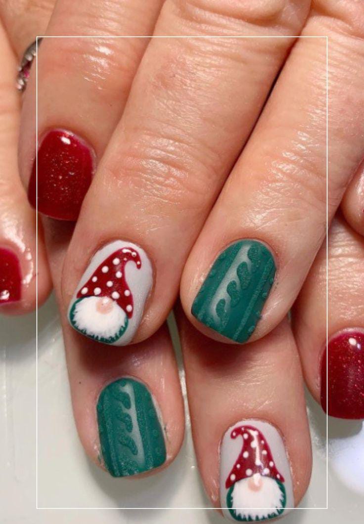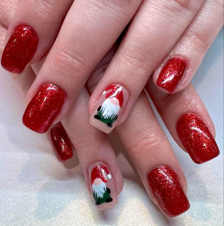 Rich red and sparkling green nails create a classic Christmas color combo, while adorable gnome accents and glittery finishes add a cheerful holiday spirit.