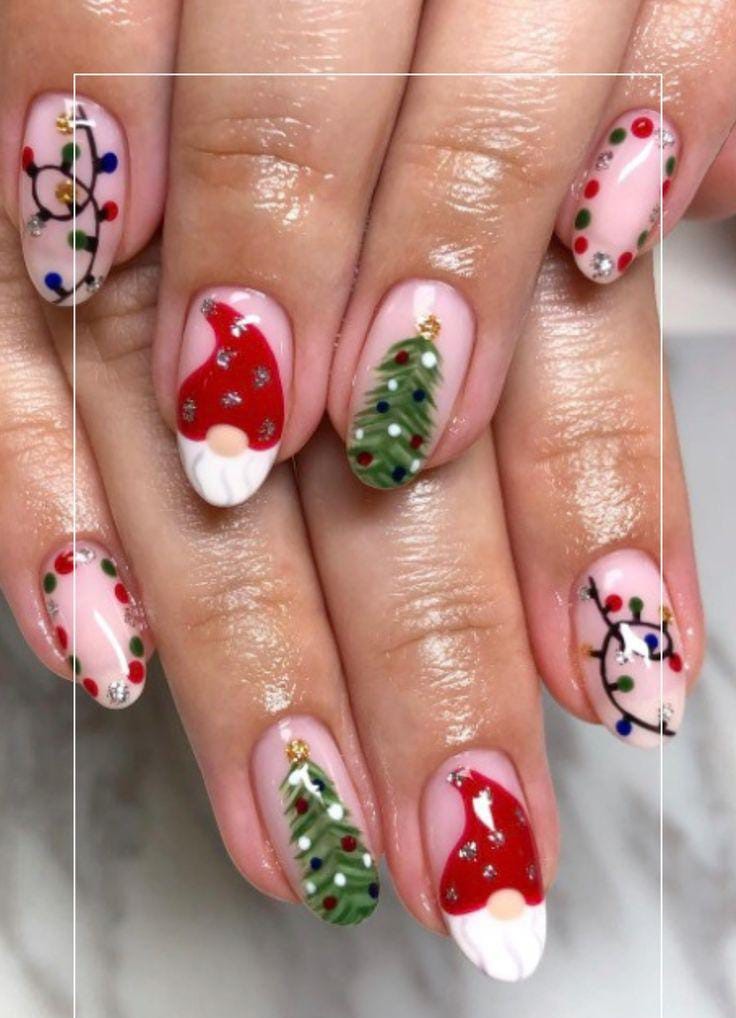 Playful and colorful, this design shows off Christmas lights, tree art, and Santa gnome motifs on a pink nude base — a fun and joyful celebration of the Christmas holiday spirit.