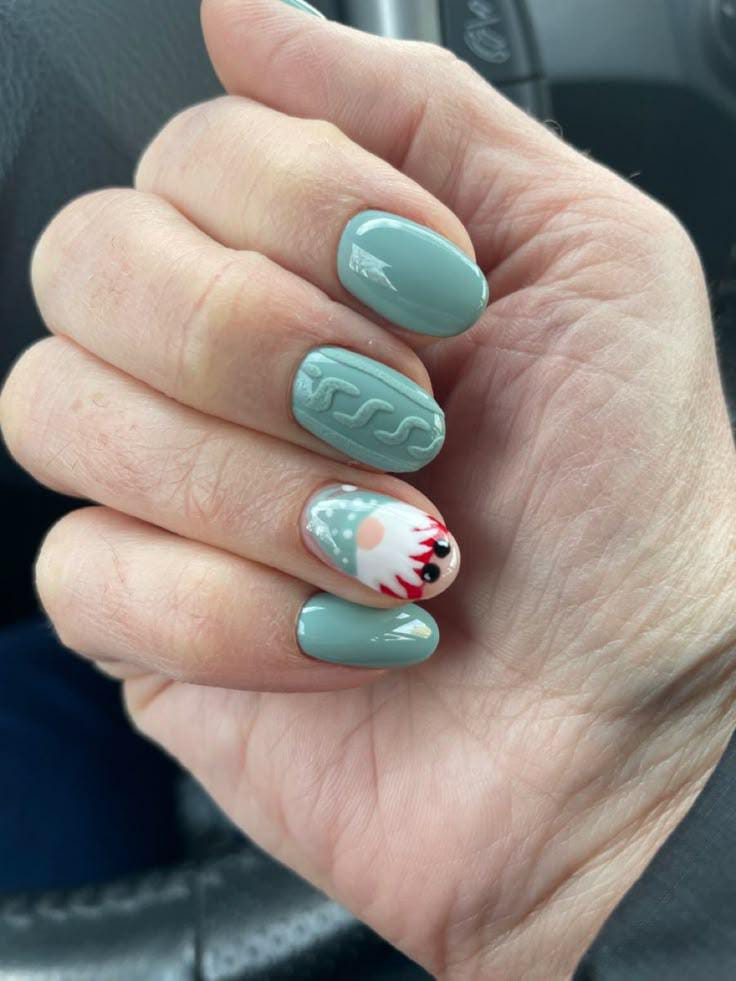 Soft mint-green nails with subtle knit-inspired textures and a charming gnome accent create a cozy yet refreshing Christmas holiday look.