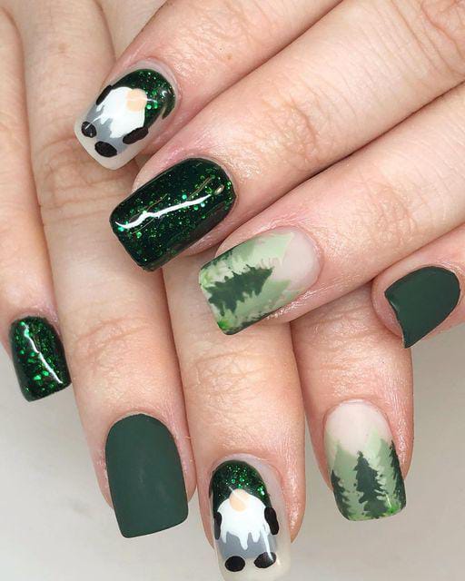 Deep greens and glittery accents come together with forest tree art and little gnome faces, giving a calm, woodland-inspired take on Christmas nail art.